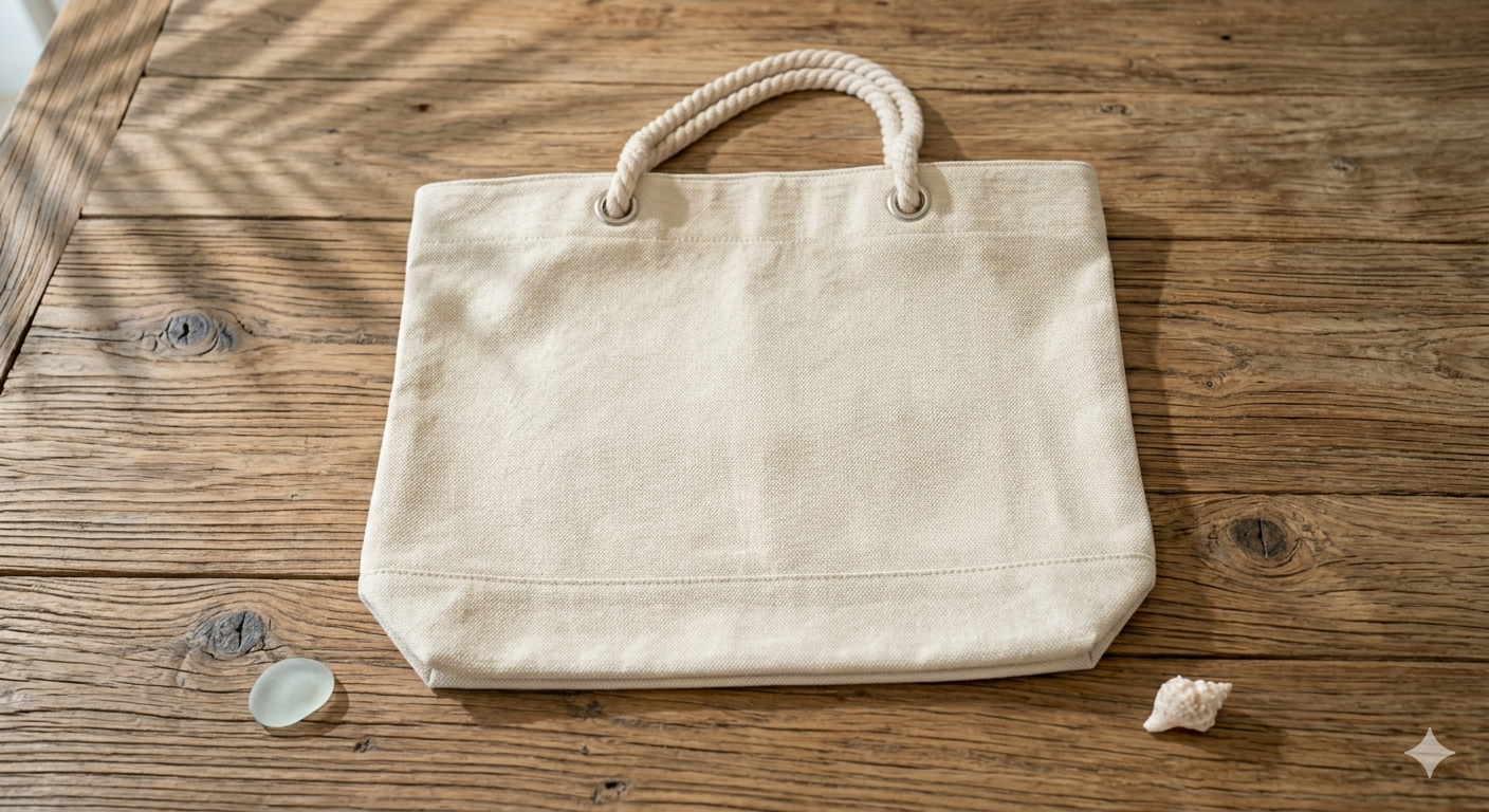 Fotografie jsou ilustrační pro znázornění designu. Úchyty tašky jsou z pevného, ​​krouceného lana typického pro plážové tašky a jsou bezpečně uchycené v kovových kroužcích.