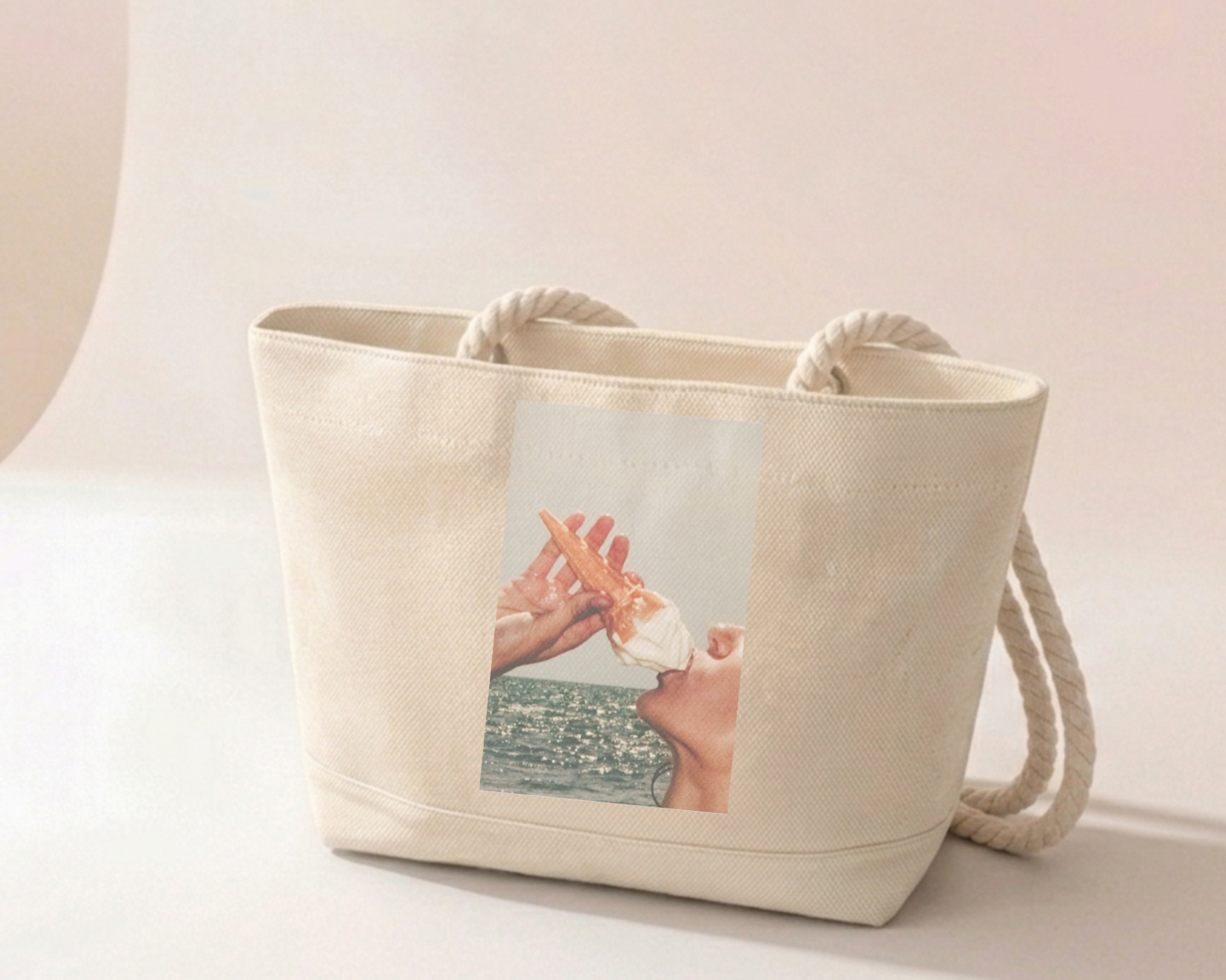 Fotografie jsou ilustrační pro znázornění designu. Úchyty tašky jsou z pevného, krouceného lana typického pro plážové tašky a jsou bezpečně uchyceny v kovových kroužcích.